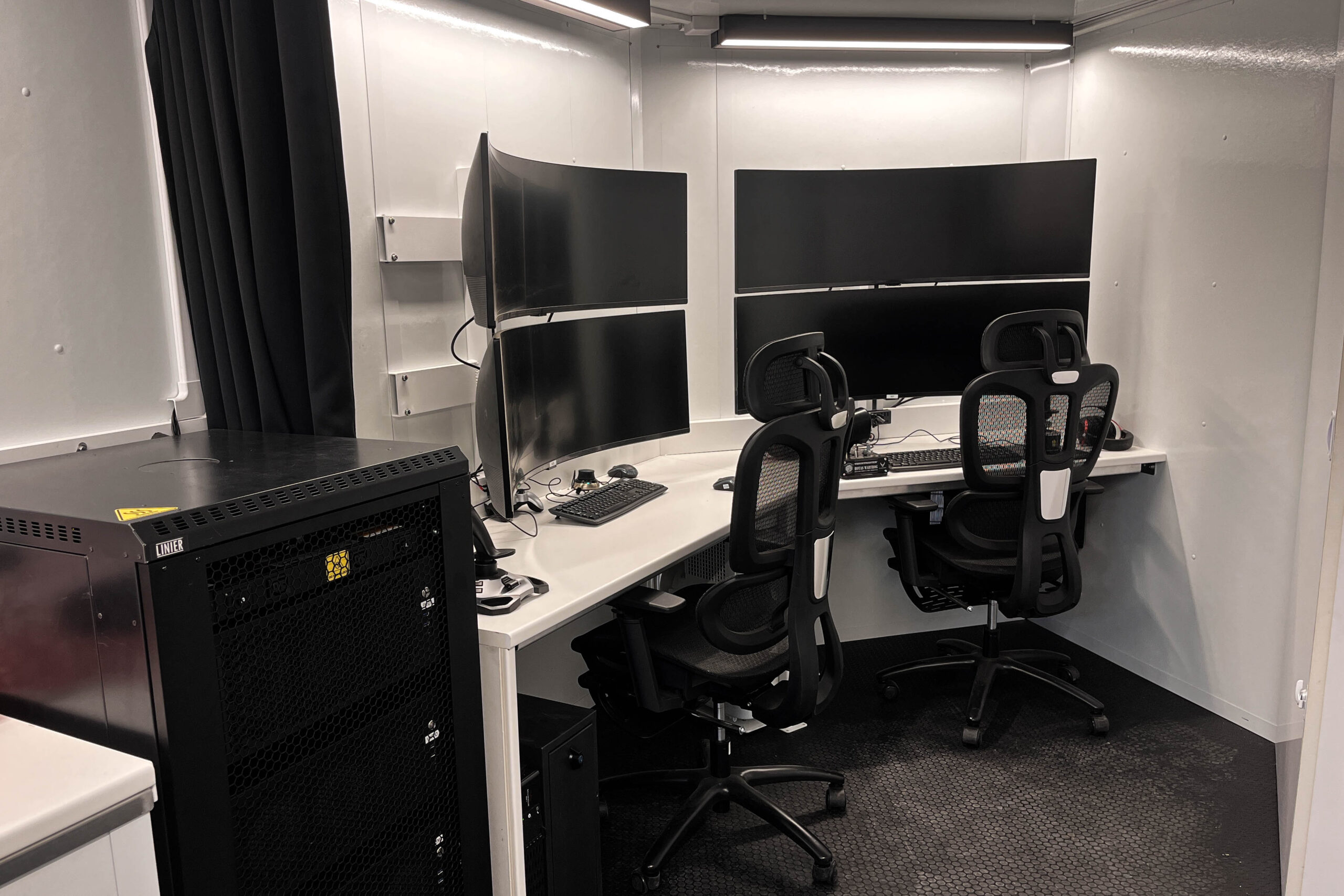 The Instructor and Pilot Stations provide two fully equipped setups for instructor and pilot operator use. Each station features two stacked 49″ curved monitors, delivering expansive, high-resolution displays for real-time scenario monitoring and control. A retractable curtain can isolate this section from the rest of the trailer, ensuring privacy and preventing other students from viewing the active operator.